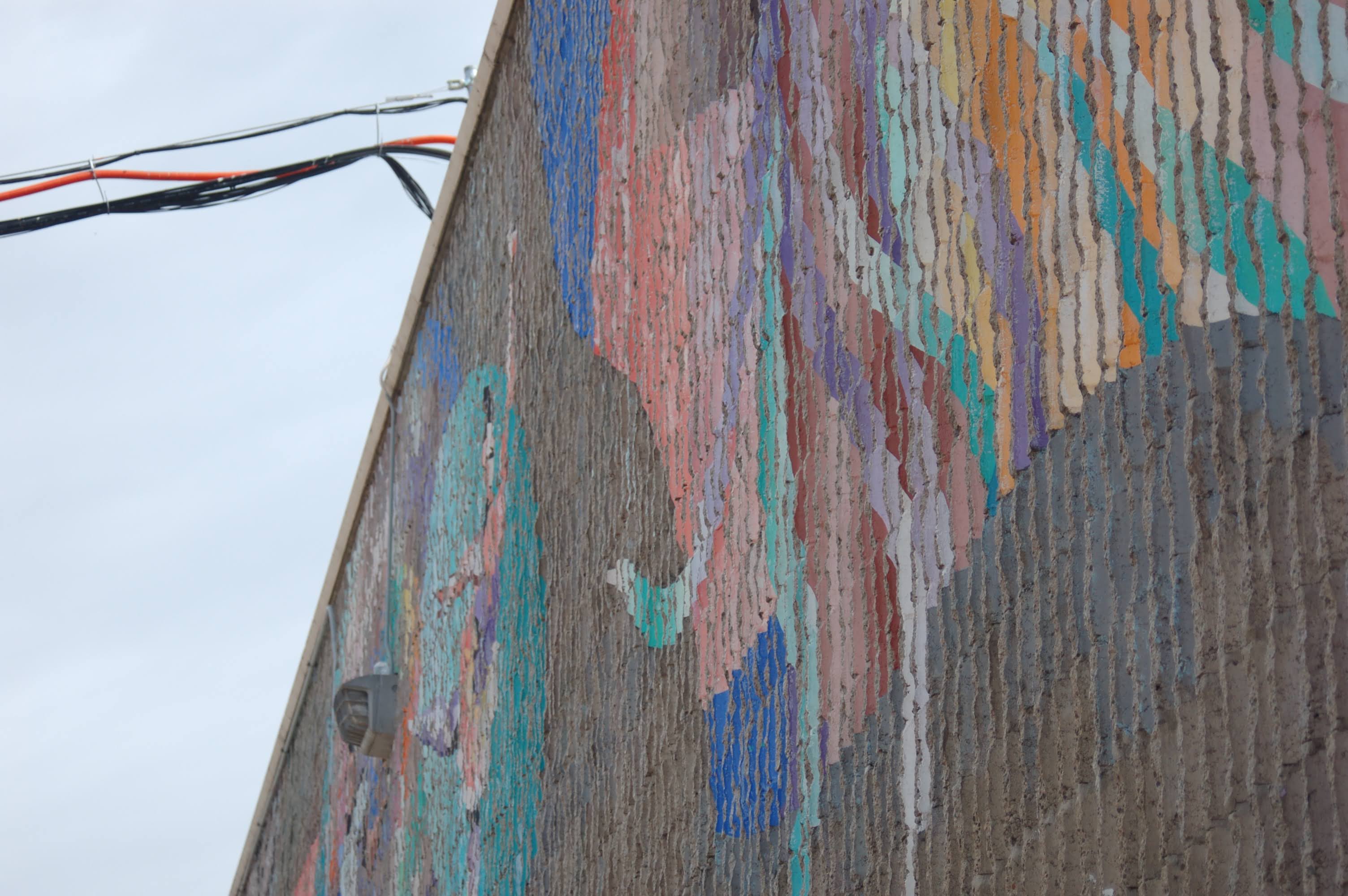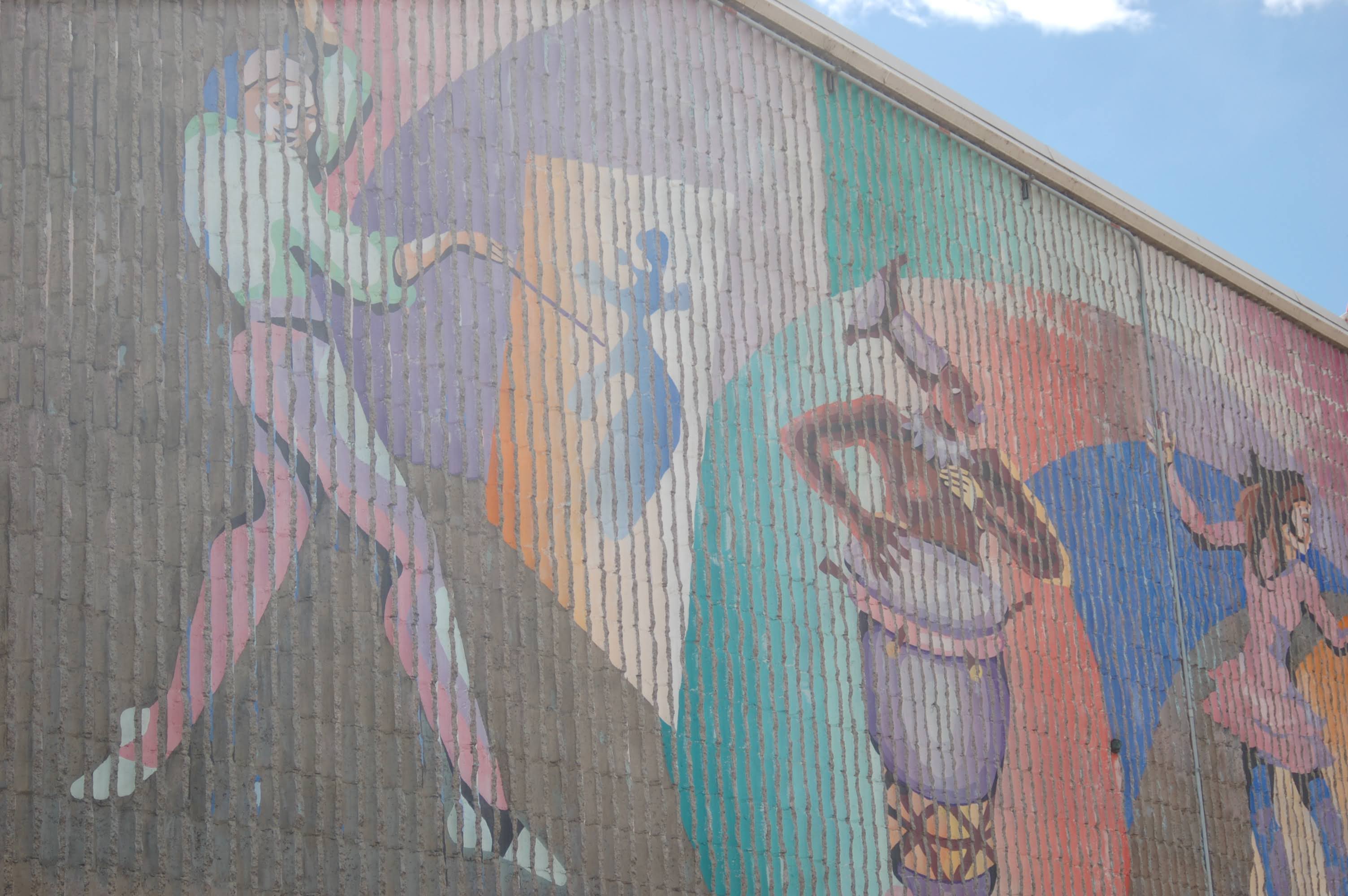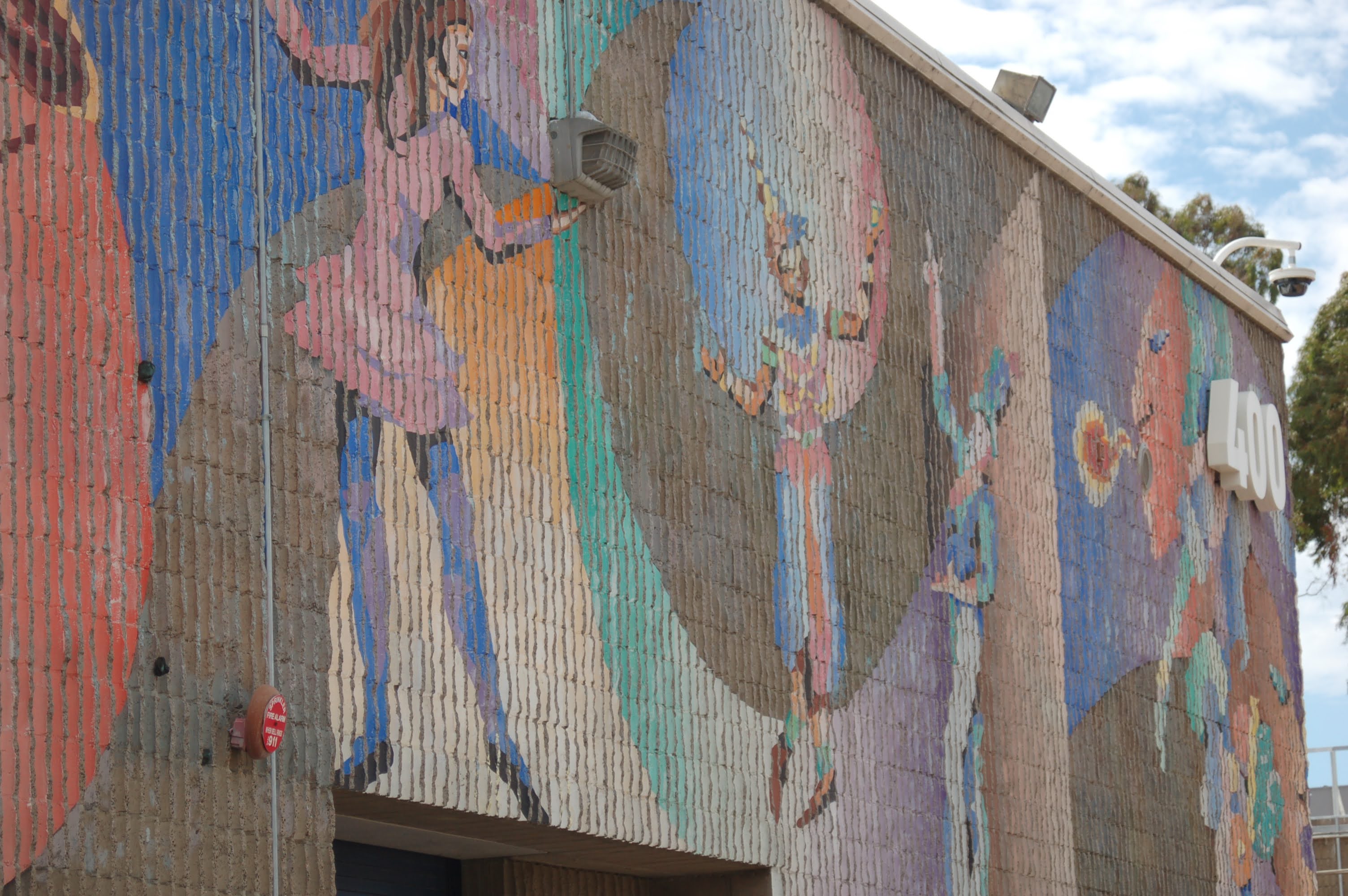 Lorena Loaiza's mural is installed on the outer wall of Building 400, which houses arts classrooms. Measuring 140 feet wide by 15 feet high, it depicts a vibrant tapestry of creative people performing. Acrylic paint applied directly onto the fluted concrete exterior of the building means the image viewers see depends on their point of view. Dedicated on May 28, 1992, Loaiza worked with over 40 SDHS art students to create the mural.