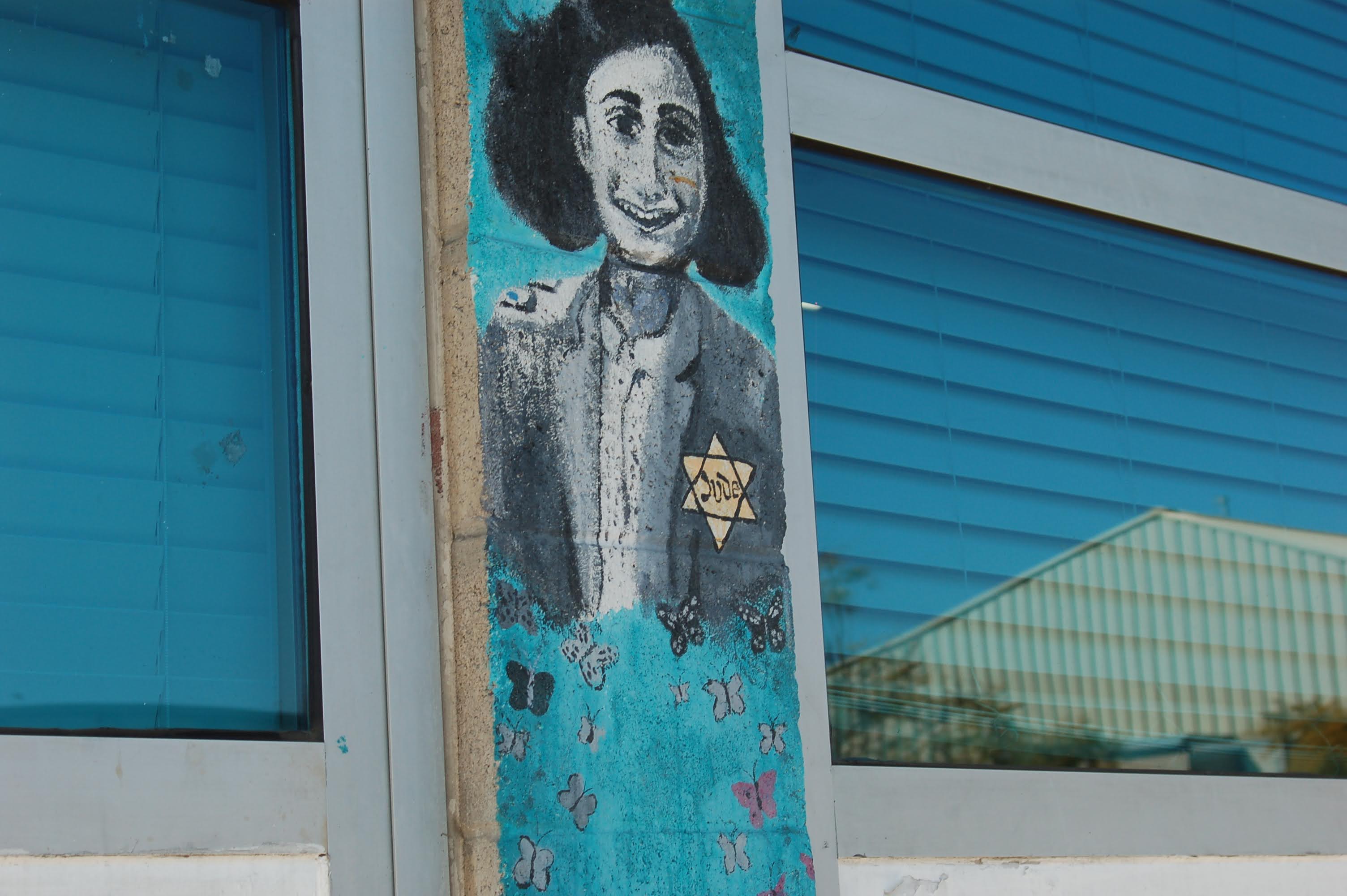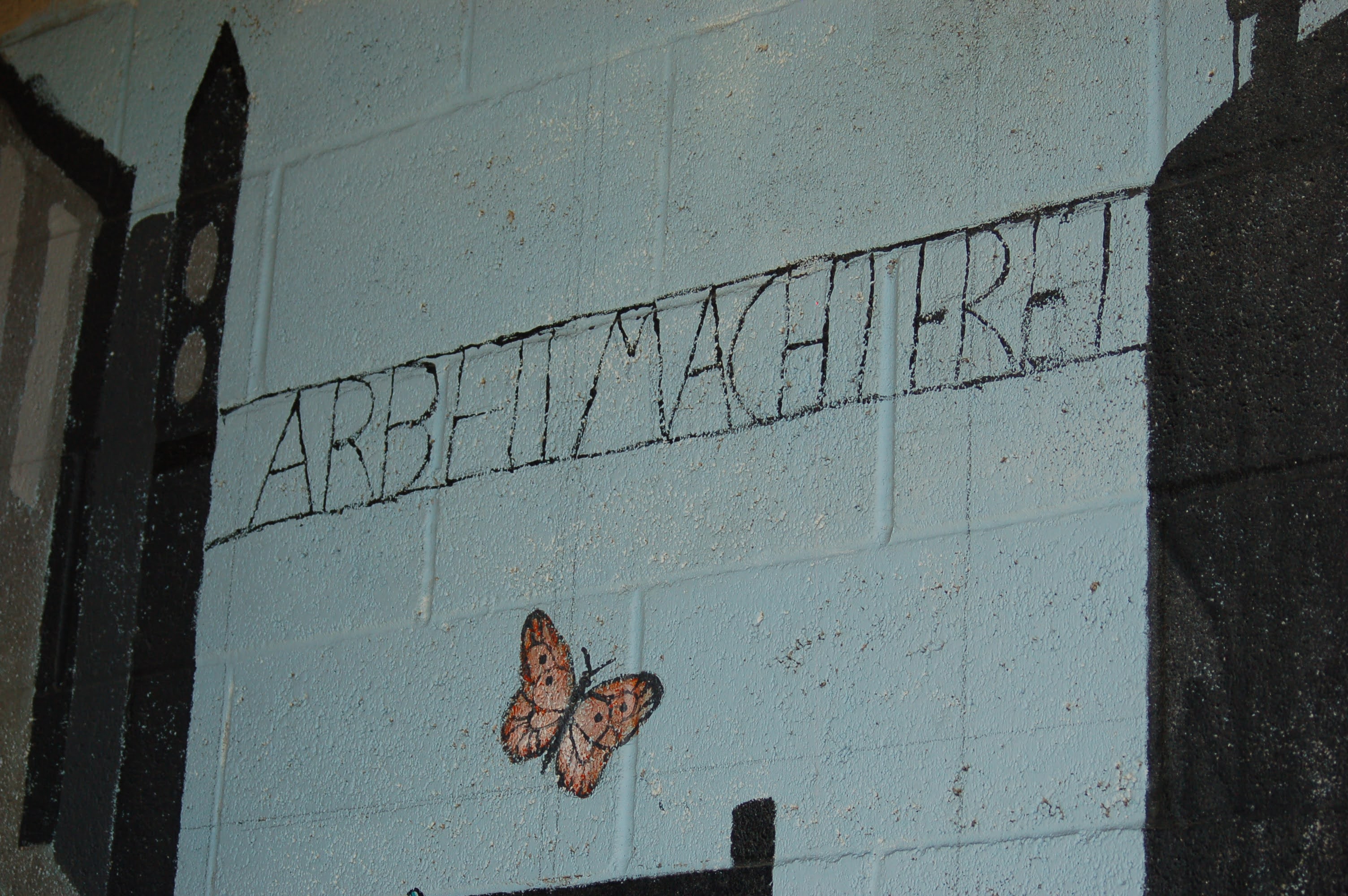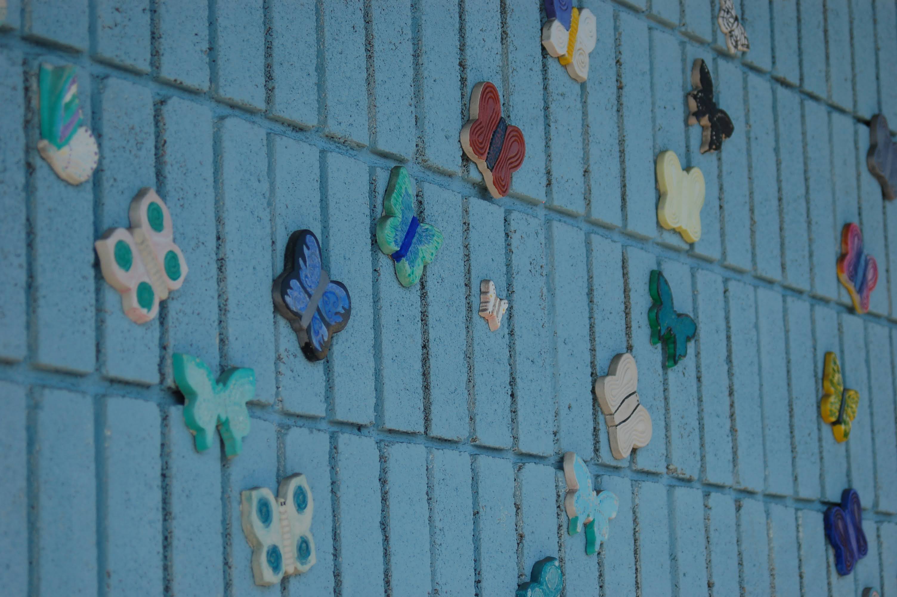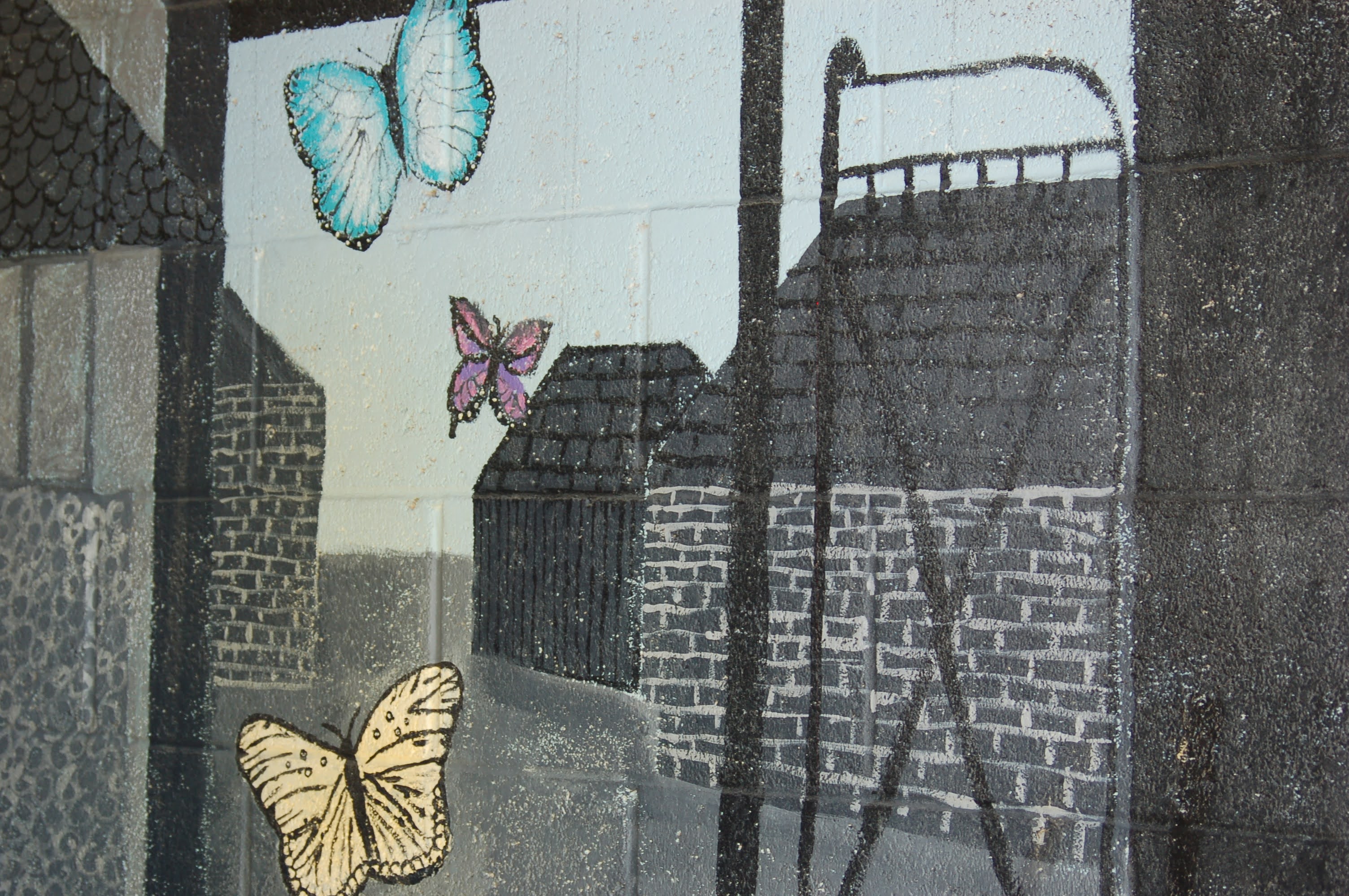 Created in 2013 by students in the Did You Know? Club, The Butterfly Project is a series of vividly-painted ceramic butterflies located on the west-side second level mezzanine of the 900 building. Part of the national Butterfly Project, each represents one of the 1.5 million children killed during the Holocaust. A set of murals accompany the butterflies, portraying - with great detail and care - icons such as the gates of the Auschwitz concentration camp and a young Anne Frank. Inscribed below the stream of butterflies is the following, from Pavel Friedmann's poem The Butterfly, written while Friedmann was interned at the Theresienstadt concentration camp:
