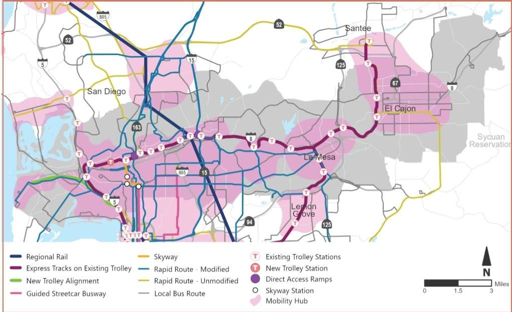 The Purple Line is a proposed regional transit line going from Sorrento Valley to San Ysidro, taking an inland route. Part of SANDAG’s vision for a network of “Transit Leap” lines, we’re not sure how many of its characteristics the Purple Line will take from the existing Trolley lines, heavy metro, or regional rail. We will have continuing dedicated Journal coverage for this line soon. The line factors into the Kumeyaay Corridor thanks to its stop at Stadium station for a Green Line transfer, also at Stadium station would be a Direct Access Ramp (DAR) from I-15 for a transfer to the 235 Rapid in Alt 1. Purple Line is long term (likely after 2035), while I-15 DAR is a midterm project that will likely be complete before 2035.