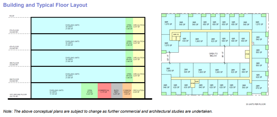 There are options for the project to be changed, the development needs to fulfill a few requirements. Has 15% affordable units or more. Prevailing wage labor. Green energy. Activates the ground floor, here planned with proposed child-care center, commercial and community space. Another goal is to have something built here quick, with the developer planning a late 2027 proposed opening.