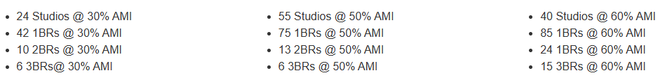 With 82 units at 30% AMI, 149 at 50%, and 164 at 60%. The unit mix for ami is spread fairly evenly, the majority of units in the building will be Studios and One Bedrooms. With Two and Three Bedrooms being the minority in the total unit count due to taking up more space. More 3 bedrooms are 60% ami but otherwise it is spread evenly. There are 119 Studios, 202 One Bedrooms, 47 Two Bedrooms, and 25 Three Bedrooms. 5 units are planned to be employee and resident manager units as part of this project is senior housing.