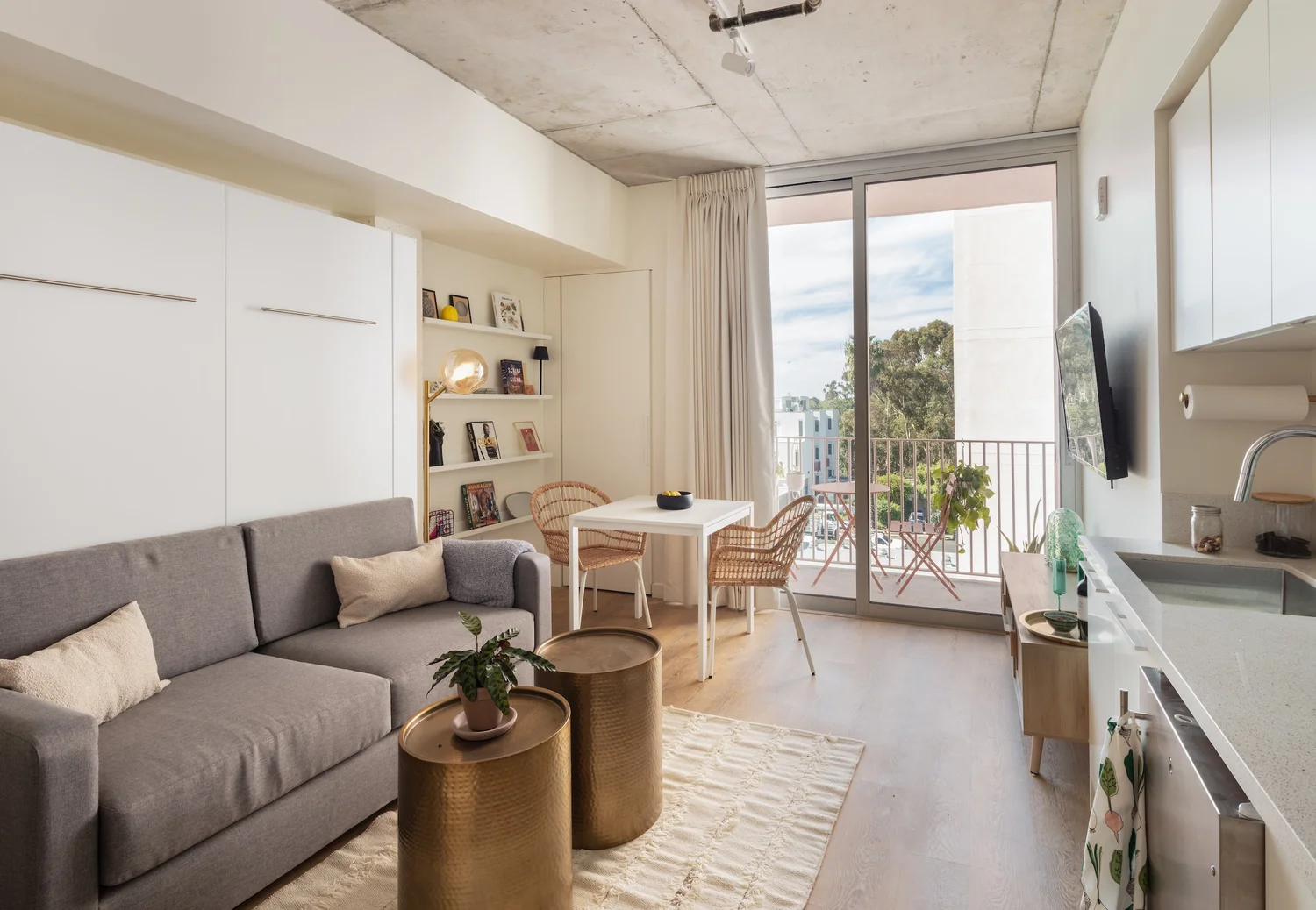 The design of the curved facade on the side was accomplished by purchasing air rights from the neighboring property, which allows for more units to have large windows. With the narrow lot this is necessary to maximize the number of units here. Given the precedent from previous developments the units are likely studios and 1 bedrooms. Being designed to be compact yet spacious with murphy beds and other folding or compact furniture.