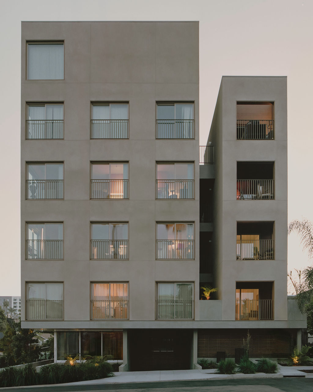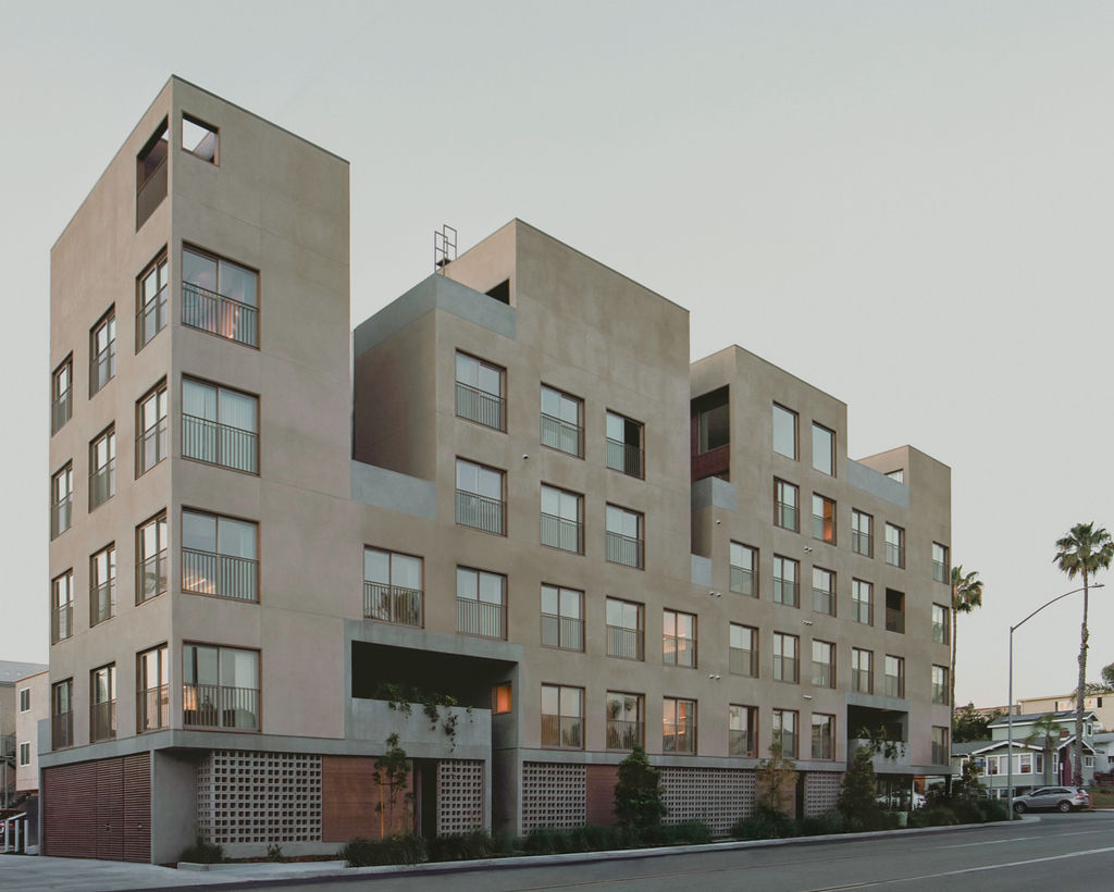 Rising five stories in total, the project pairs a Type I-B concrete podium level containing parking, storage, and ground-floor residential units with four levels of Type V-A wood-frame housing above—a common but efficient construction strategy for dense infill sites across San Diego. The development was made possible through the city’s Complete Communities Housing Solutions program, allowing higher residential density in exchange for proximity to transit and neighborhood services.