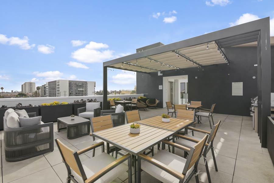 Even within its compact scale, the project prioritizes shared space. A communal area at ground level gives residents a place to gather, work, or relax, while a rooftop deck on the fifth floor opens views across North Park’s rooftops—a reminder of the neighborhood’s still-human scale despite increasing density. Parking is kept intentionally minimal, with only two spaces provided, signaling a lifestyle built around walkability, transit access, and proximity to North Park’s cafés, restaurants, and commercial corridors.