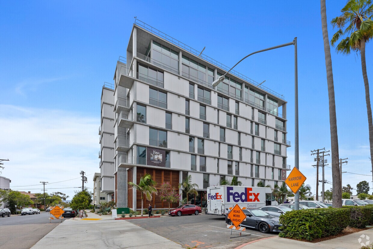 Designed by Jeff Svitak and developed as a joint venture between Svitak and CAST Communities, Kaya is architecturally unique, especially in regards to the neighboring new developments in Bankers Hill. The corridors between units on the upper floors are all open to the outside, and the massing of the building is broken up into 4 slender vertical strips on its short edge. This is contrasted by a long edge that reads as somewhat monolithic, only broken up by non-sequentially arranged windows, punched balconies, and expression of the concrete slabs to “reflect the honesty of the building elements.”