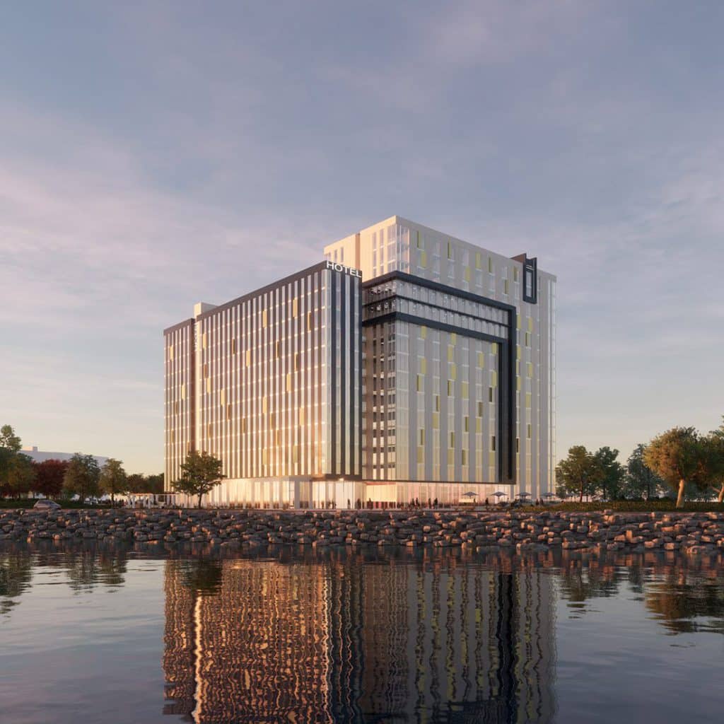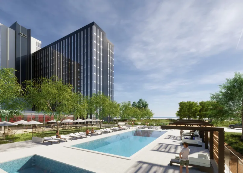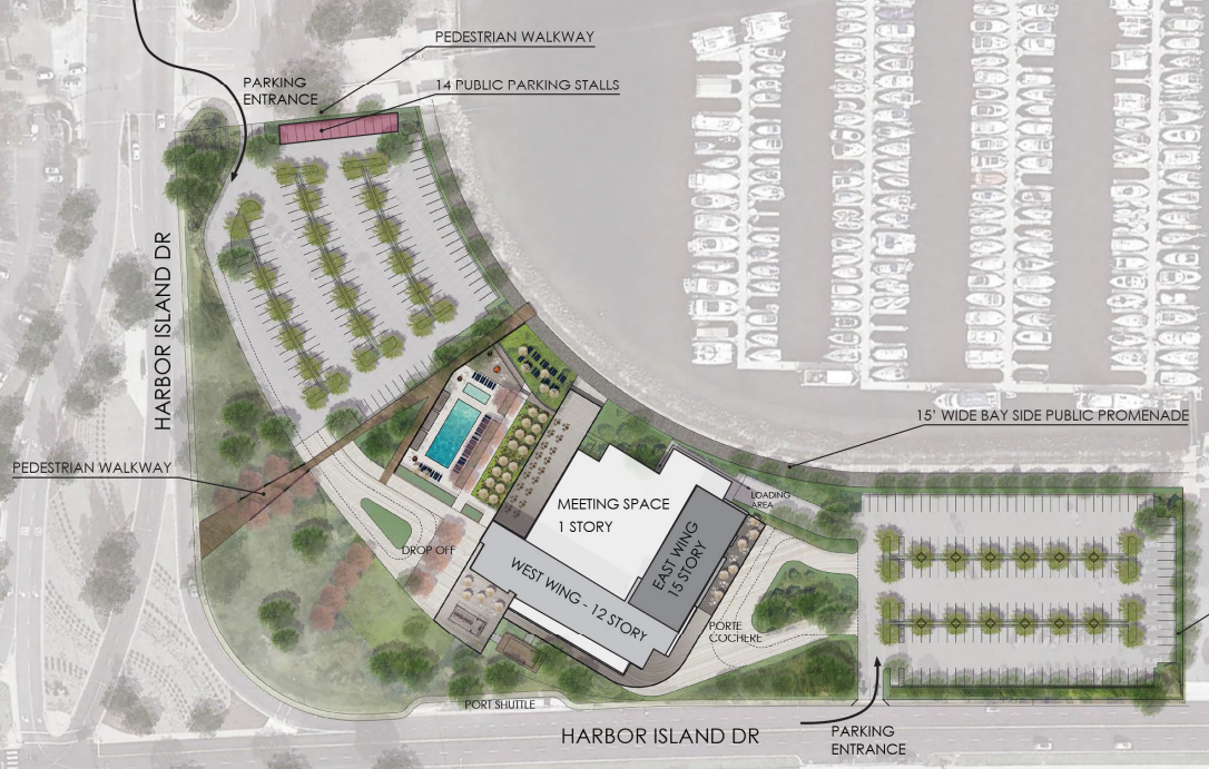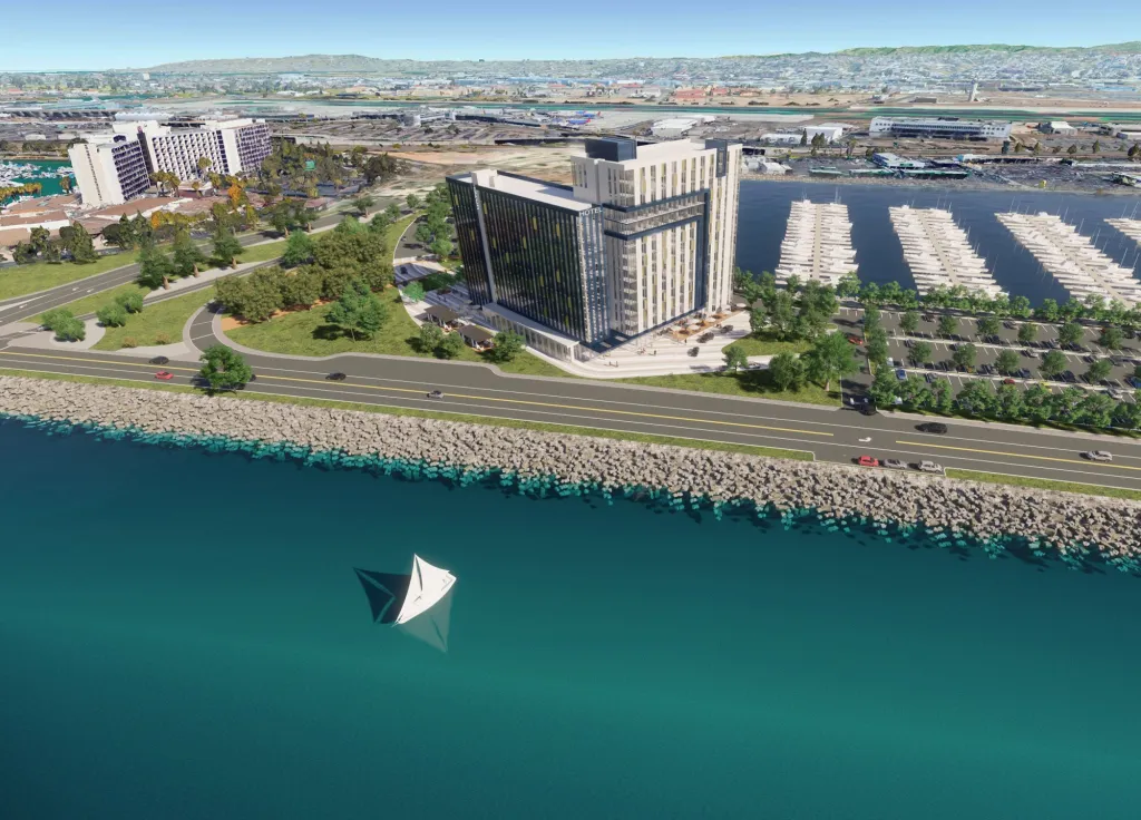 A new hotel, developed by Sunroad Enterprises and the Port of San Diego, is due to arrive on Harbor Island soon. Due to the land being reclaimed coastal tidelands, the site is under lease to Sunroad from the Port - with strict criteria on what can be developed there. One of these conditions is that land uses in the area must be public facing, hence Sunroad's hotel concept.