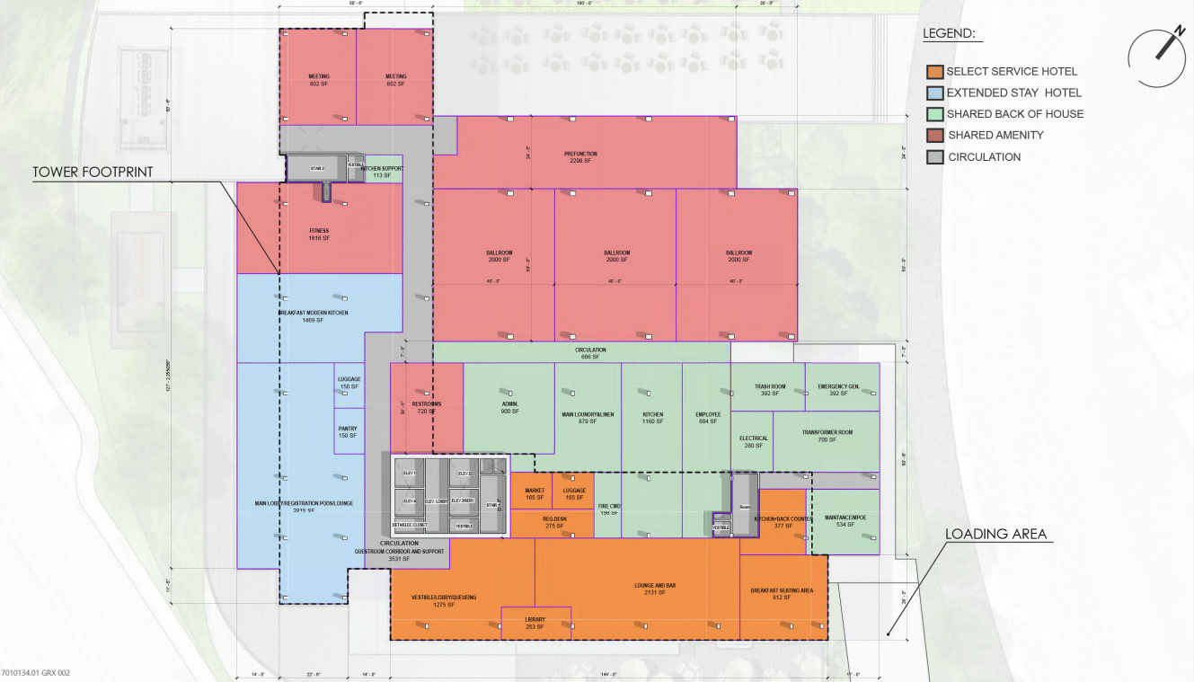 The ground floor will have shared back of house services between both hotels, including kitchen space, administrative services, laundry and cleaning services, and more. The extended stay hotel will have a dedicated lobby and large dining room for meal service, as well as a special kitchen. The limited service hotel will have a small lobby and a breakfast dining area.