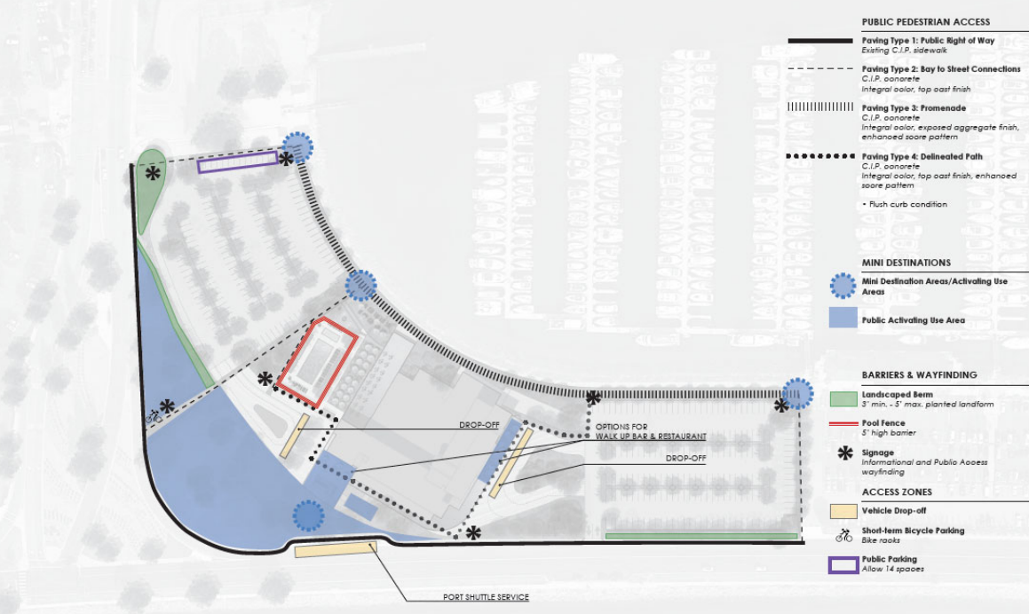 The project also includes new pedestrian pathways, a mixed-use trail, and new green space for public access. This pairs nicely with the Port's plan for a new promenade, connecting to a future neighborhood event space and a Top Golf. This promenade is also paired with a large new park.